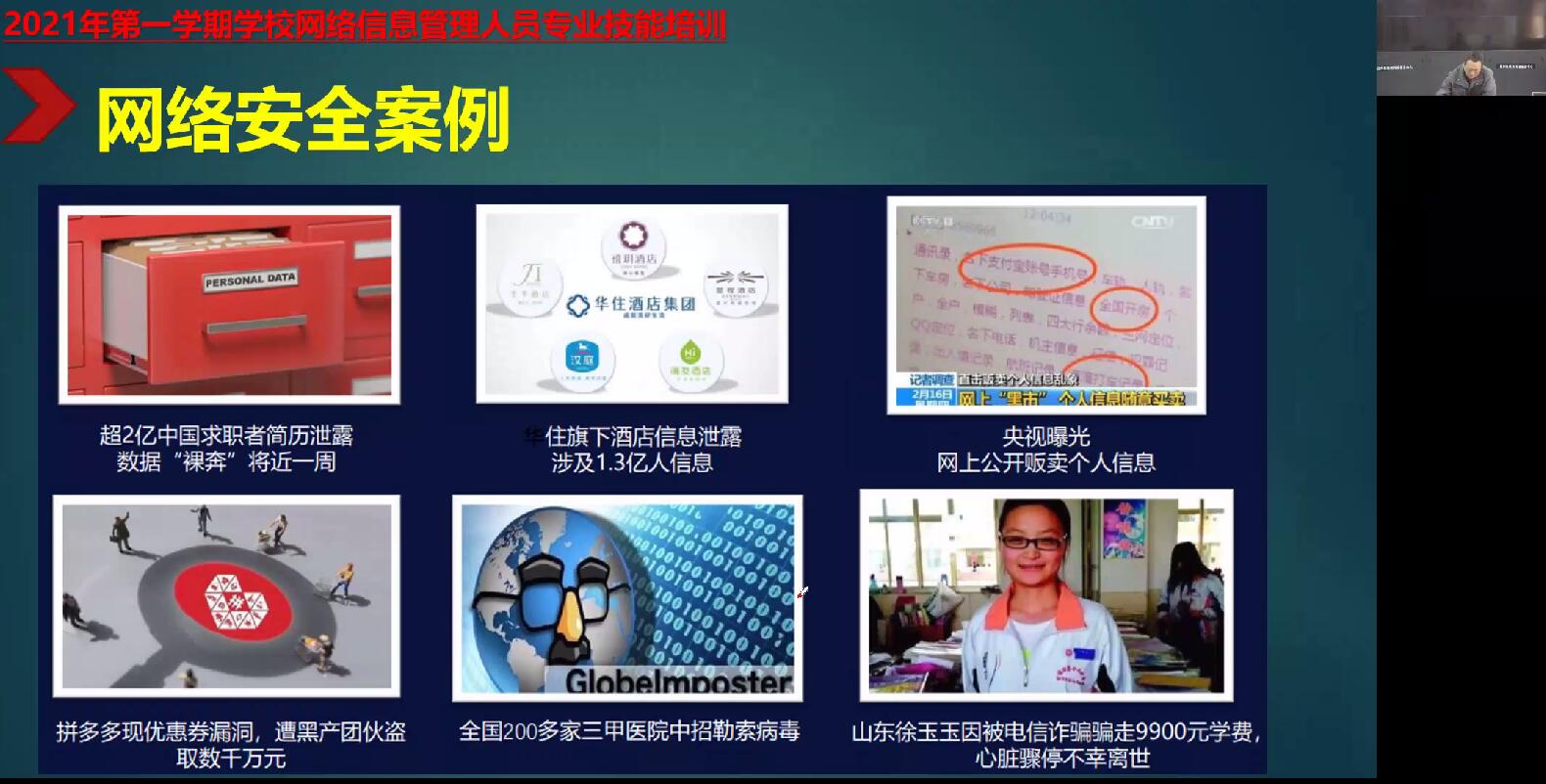 培训采用腾讯视频会议方式,对全区共性网络管理和困惑问题进行讲解。培训内容主要包括:校园网络管理技能、可视一键报警IP地址规划、幼儿园三级监控管理等热点问题;教师教育信息化2.0微视频制作专题培训;校园网络安全知识培训,重点点评2021年网络安全宣传周总体情况。