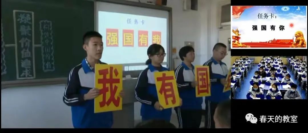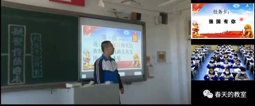 同步课堂将学生分成“强、国、有、我”四个小组。分别选出四位小先生,在课前选择任务卡后,分头进行精心准备。课上,在教师的主持引导下,每个小组分别展示任务卡相关内容,让学生亲自探究民族精神的内涵、价值及弘扬,形象有趣地阐述中国价值的内容、重要性和践行,让枯燥的理论说教变得生动有活力,让有意义的内容变得有趣味、有意思。