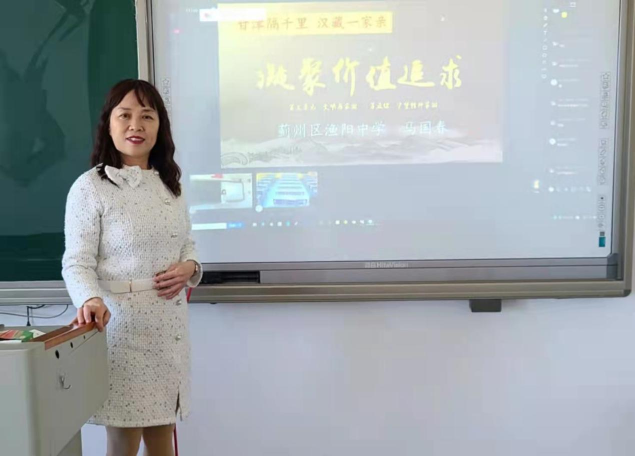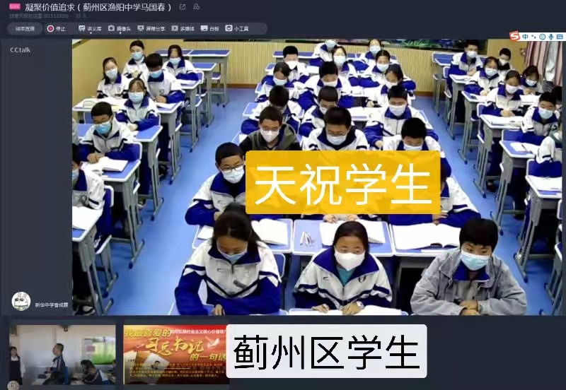 根据《天津市蓟州区“云端+”教育帮扶天祝县协作计划》安排,2021年10月27日下午,蓟州区渔阳中学马国春老师与甘肃省天祝藏族自治县新华中学九年级3班连线,共同上了一节题为《凝聚价值追求》的云端隔空思政课。